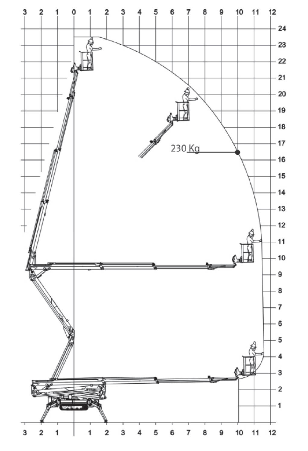 برای دسترسی به ارتفاع ۲۳/۵ متری، بالابر عنکبوتی RA24 یک انتخاب ایمن و مطمئن است. عرض این بالابر هیدرولیکی تنها ۹۹ سانتیمتر است، از این رو برای فضای داخلی بسیار مناسب است و می تواند از درب ها و راهروها عبور نماید. بالابر نفربر پیش رو مجهز به دو موتور است. یک موتور برقی ۲۲۰ ولت که استفاده از این بالابر برقی را در فضای سربسته امکان پذیر می سازد. همچنین یک موتور دیزلی که استفاده از بالابر دیزلی فوق را در فضای سرباز و جایی که دسترسی به برق نیست میسر می کند.